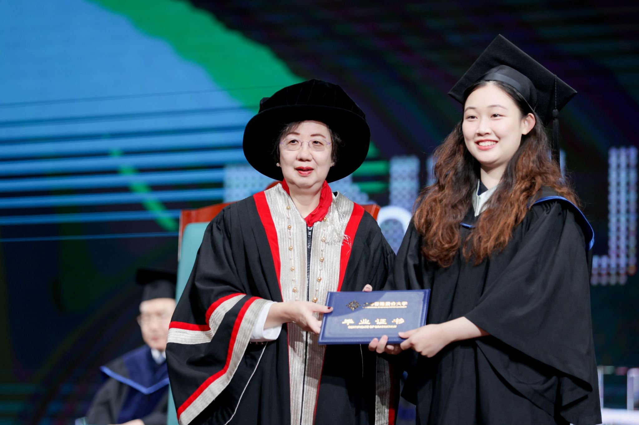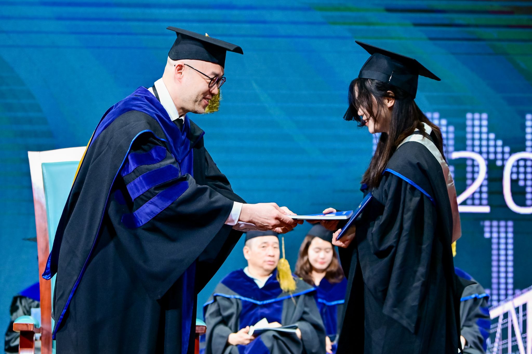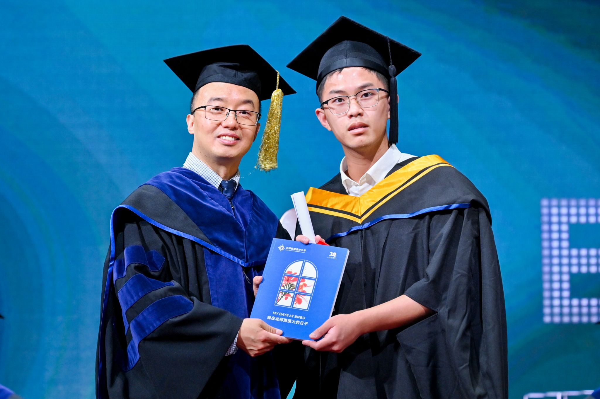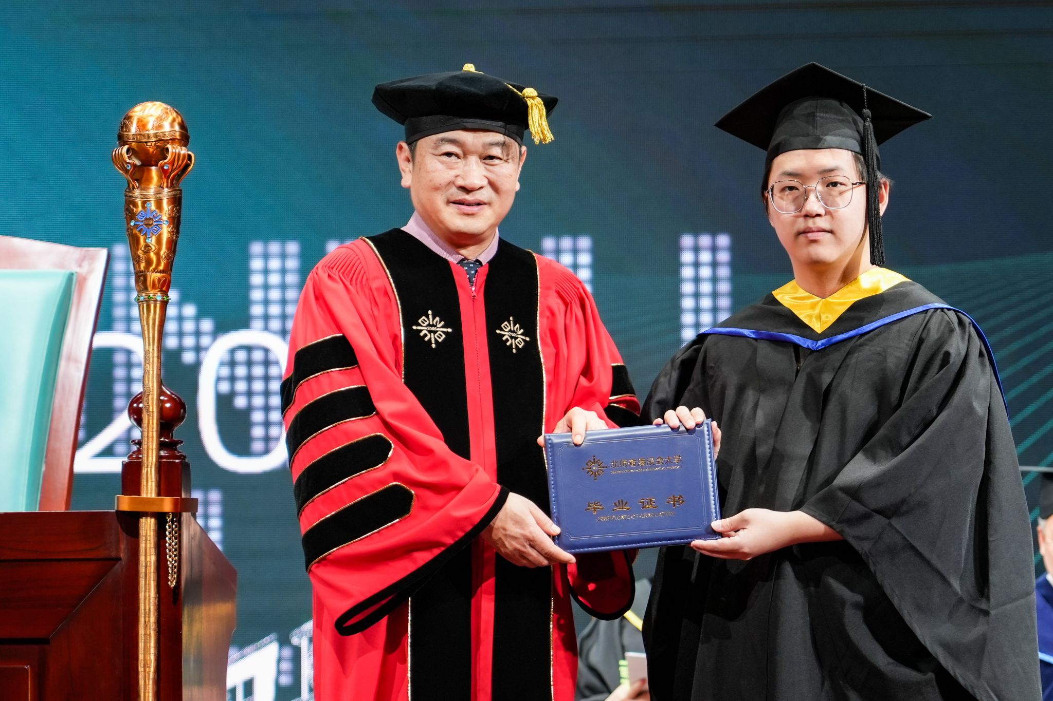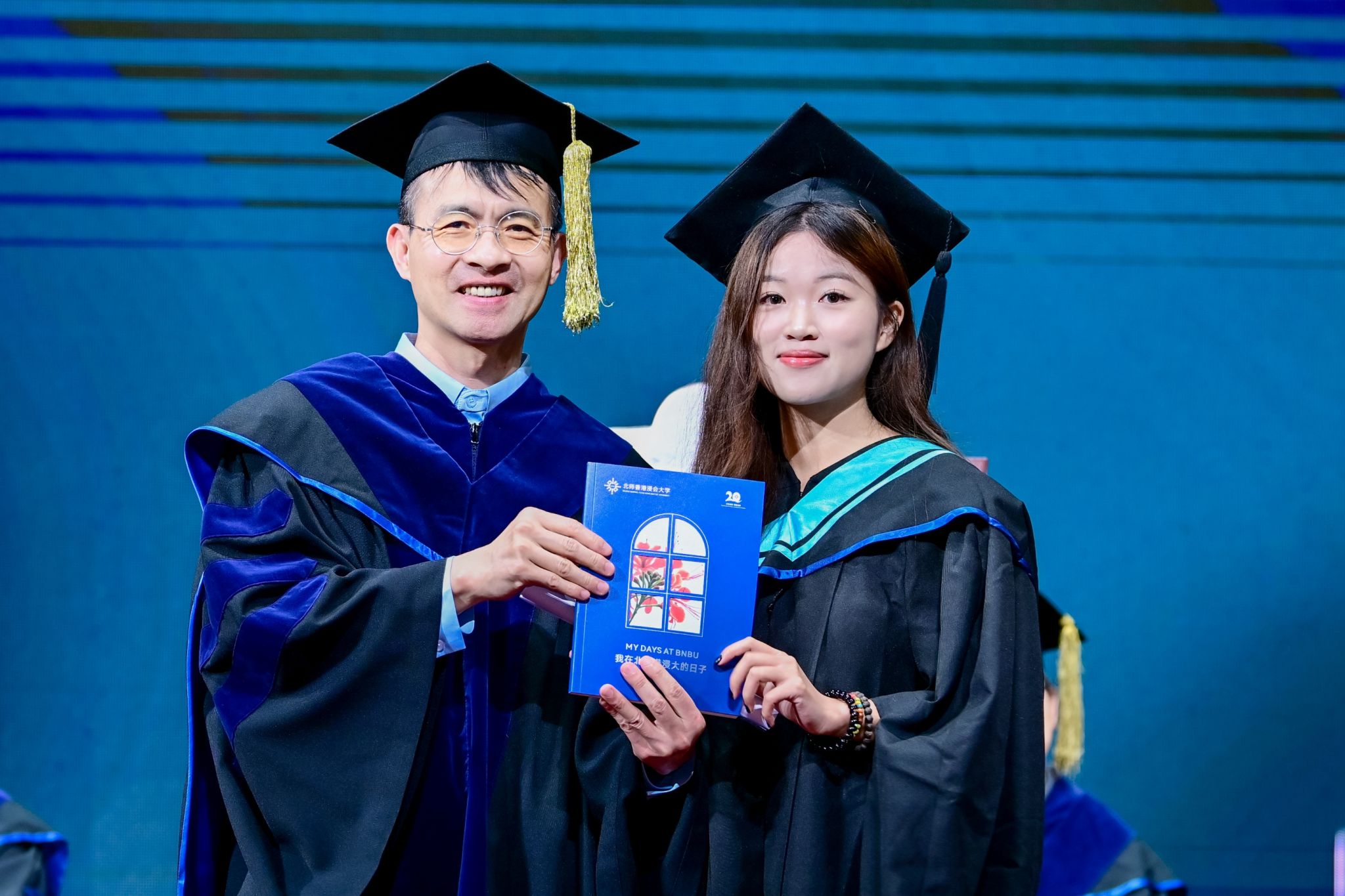 BNBU Vice President (Academic) Prof Zhou Yongming presents a graduation certificate to a graduate