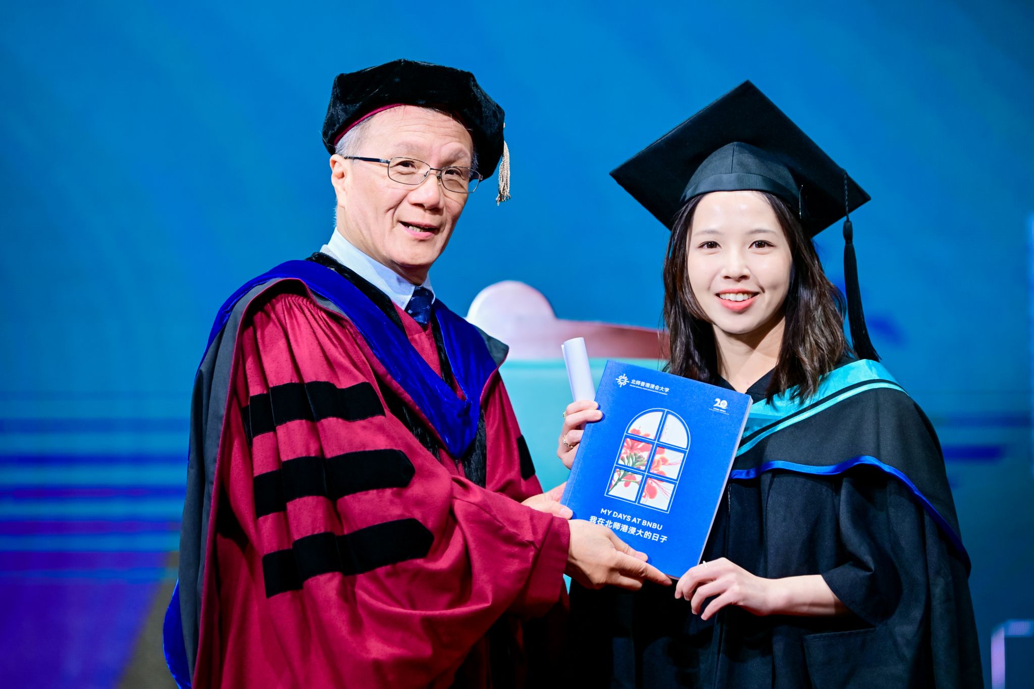 BNBU Provost Prof Patrick Chau presents a graduation certificate to a graduate