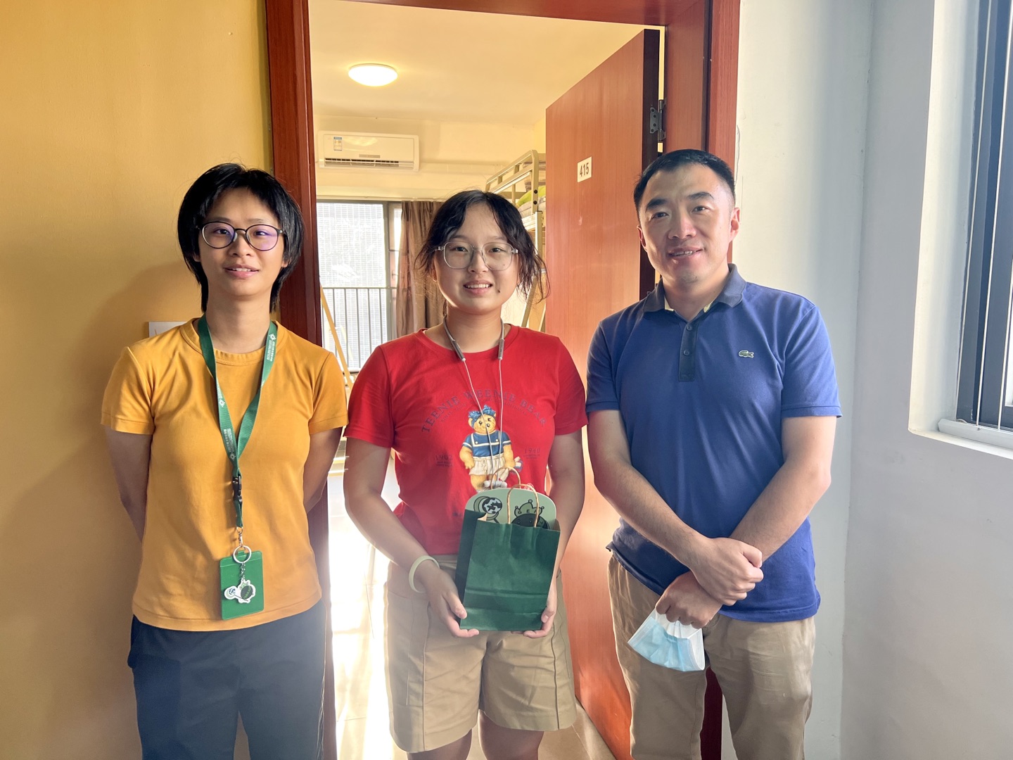 入宿日,苑舍舍监探访新生。图为署理学生事务总监、寰雅苑舍监汤绍龙博士(右)和副舍监王嘉宝博士(左)为学生派发苑舍纪念品