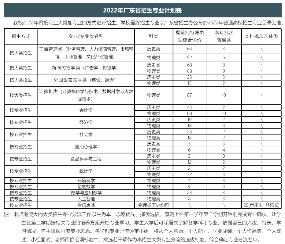 2022年,UIC继续在广东省实施多元化招生,综合评价录取计划招生人数760人(首选科目历史240人,首选科目物理520人),普通本科批次计划招生人数90人(首选科目历史25人,首选科目物理65人),本科批艺体类招生计划20人。