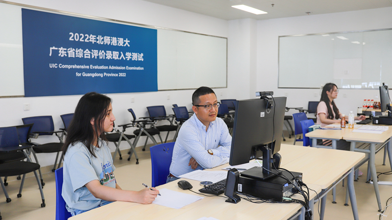 今年的综评入学测试仍采用“双机位”线上远程方式进行。测试科目为英语面试和体育。18日,中国科学院院士、欧洲科学院院士、UIC校长汤涛教授,常务副校长陈致教授,协理副校长左龙佩兰教授,招生办公室主任林群英,信息科技服务中心处长、创新中心主任卢宏洲等到考场巡视,了解考试各个环节的实时完成情况。此外,6月11至16日期间,为让考生提前了解入学测试流程,确保考试环境、设备功能等满足学校要求,学校已与所有具备考试资格的考生一对一连线,指导考生调试设备以及熟悉流程。