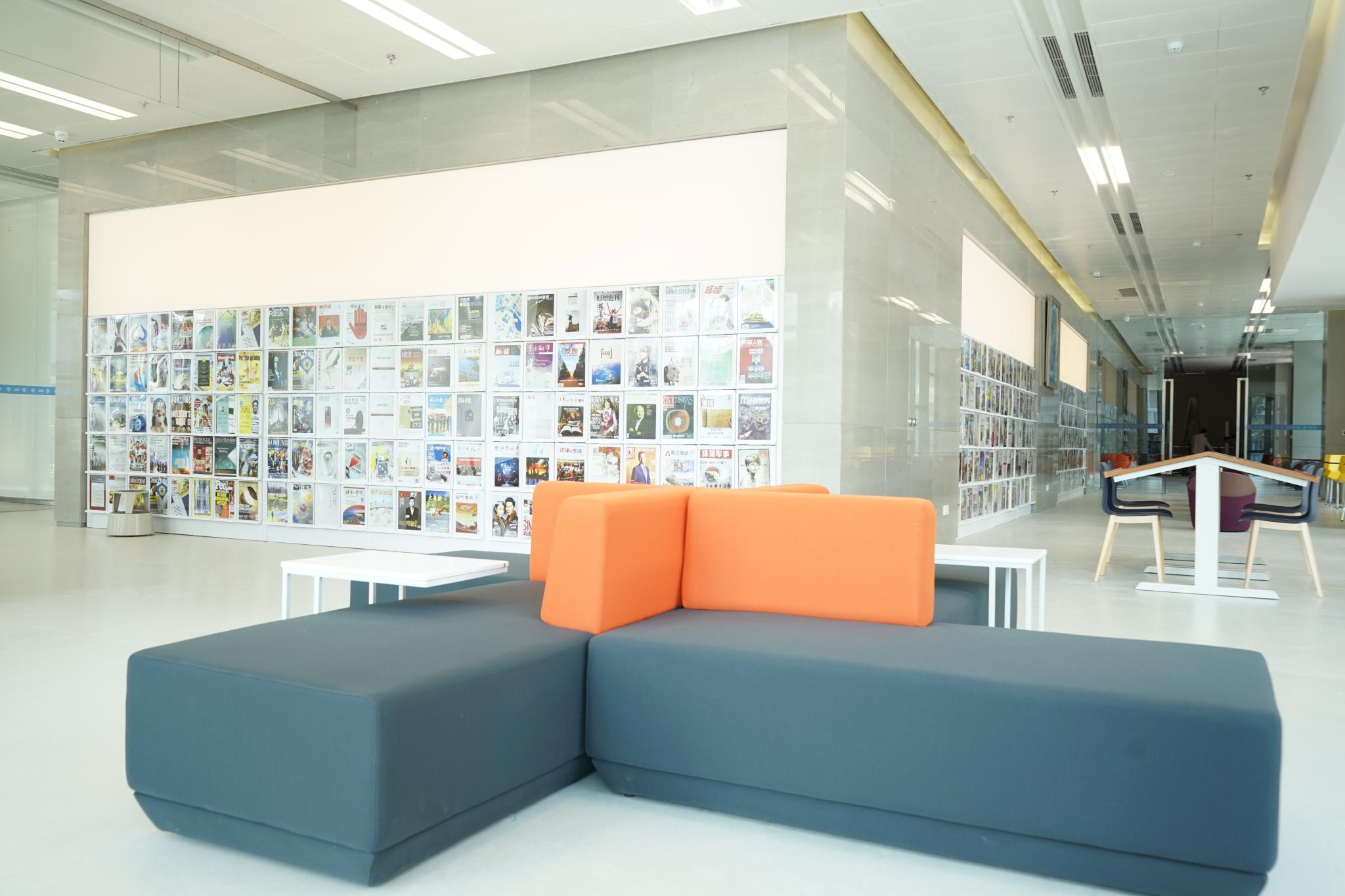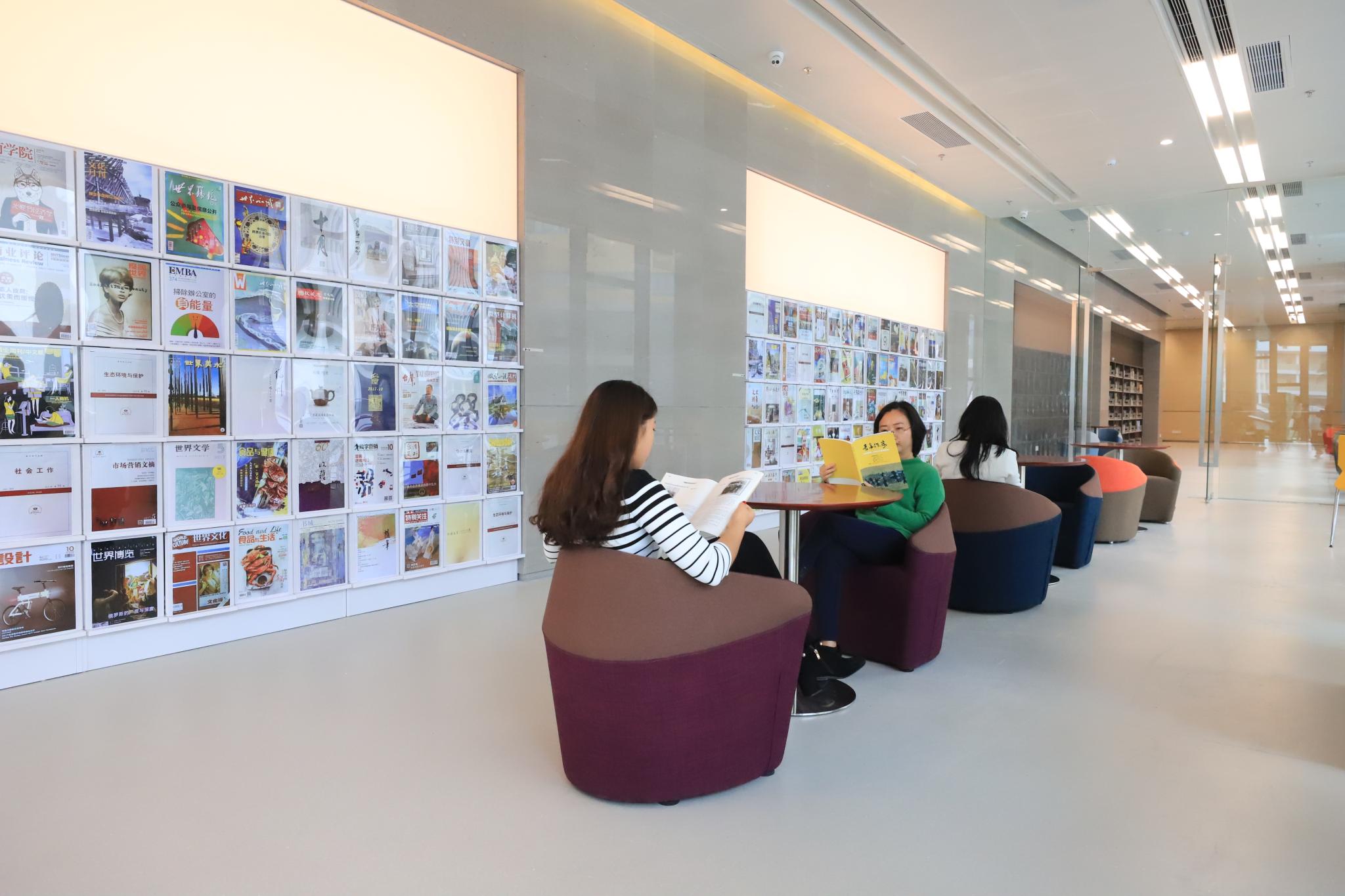 二楼的报刊阅览区提供了大量的中英文报刊杂志资源,师生可以在就近的沙发区阅读。