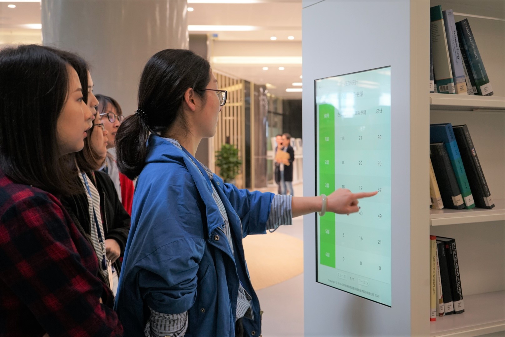 LRC的另一项“黑科技”是位于二楼的RFID智能书架。通过LED触摸屏,UICer可以迅速查找到书籍的具体位置,点选某一本书籍,其所在书架的灯会同时亮起,帮助UICer快速找到目标书籍。