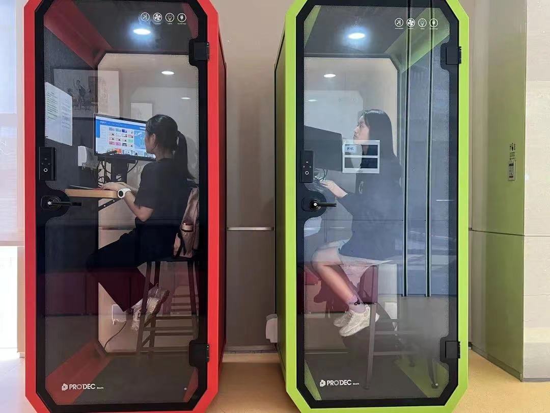 静音舱是一大亮点,学生可以使用MET系统练习英语口语。高分子隔音材料组成多重音障,无需担心影响其他同学。内部空气每三分钟刷新一次,保证舒适体验。