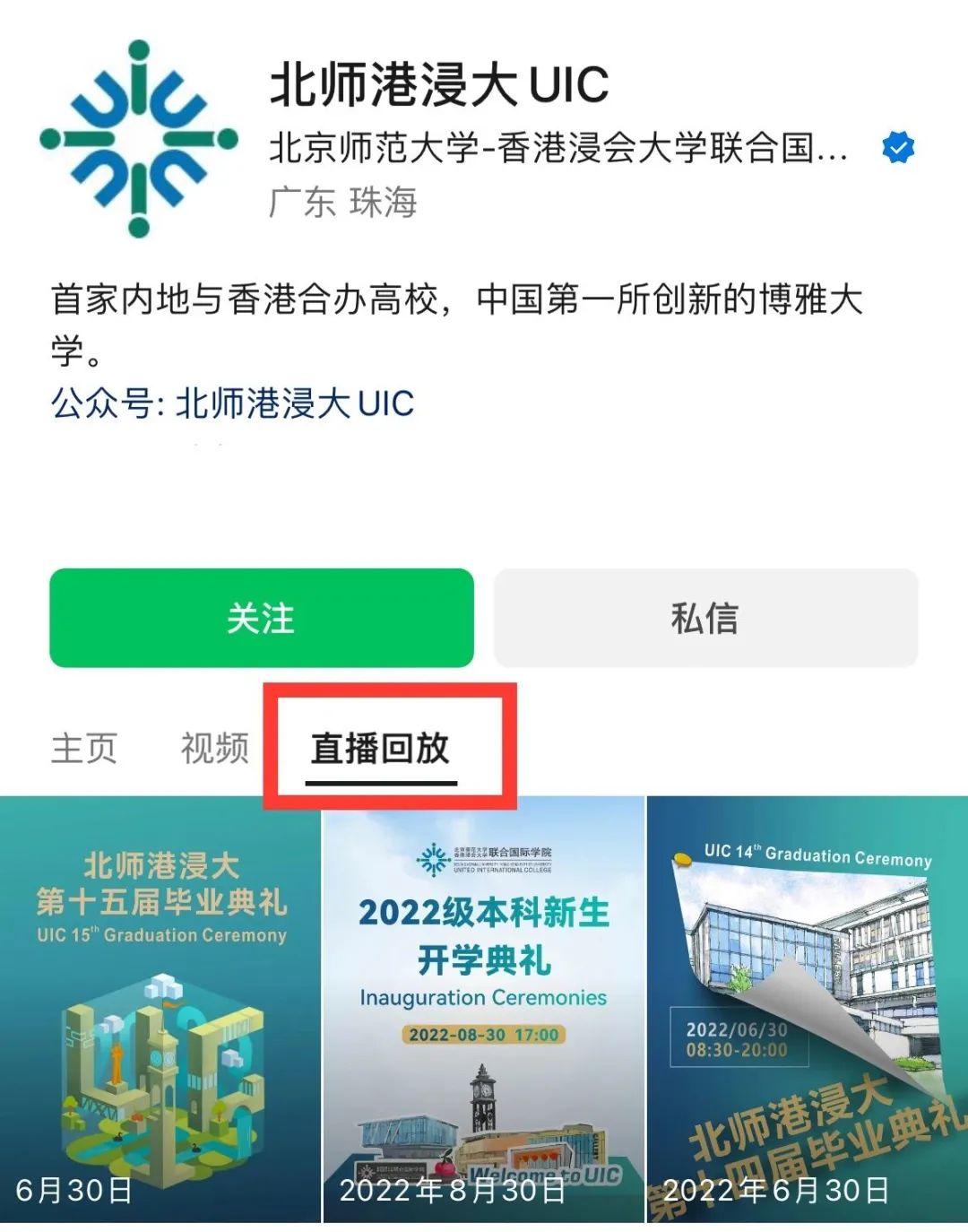 方式一:进入视频号“北师港浸大UIC”主页,点击首页“直播回放”观看。