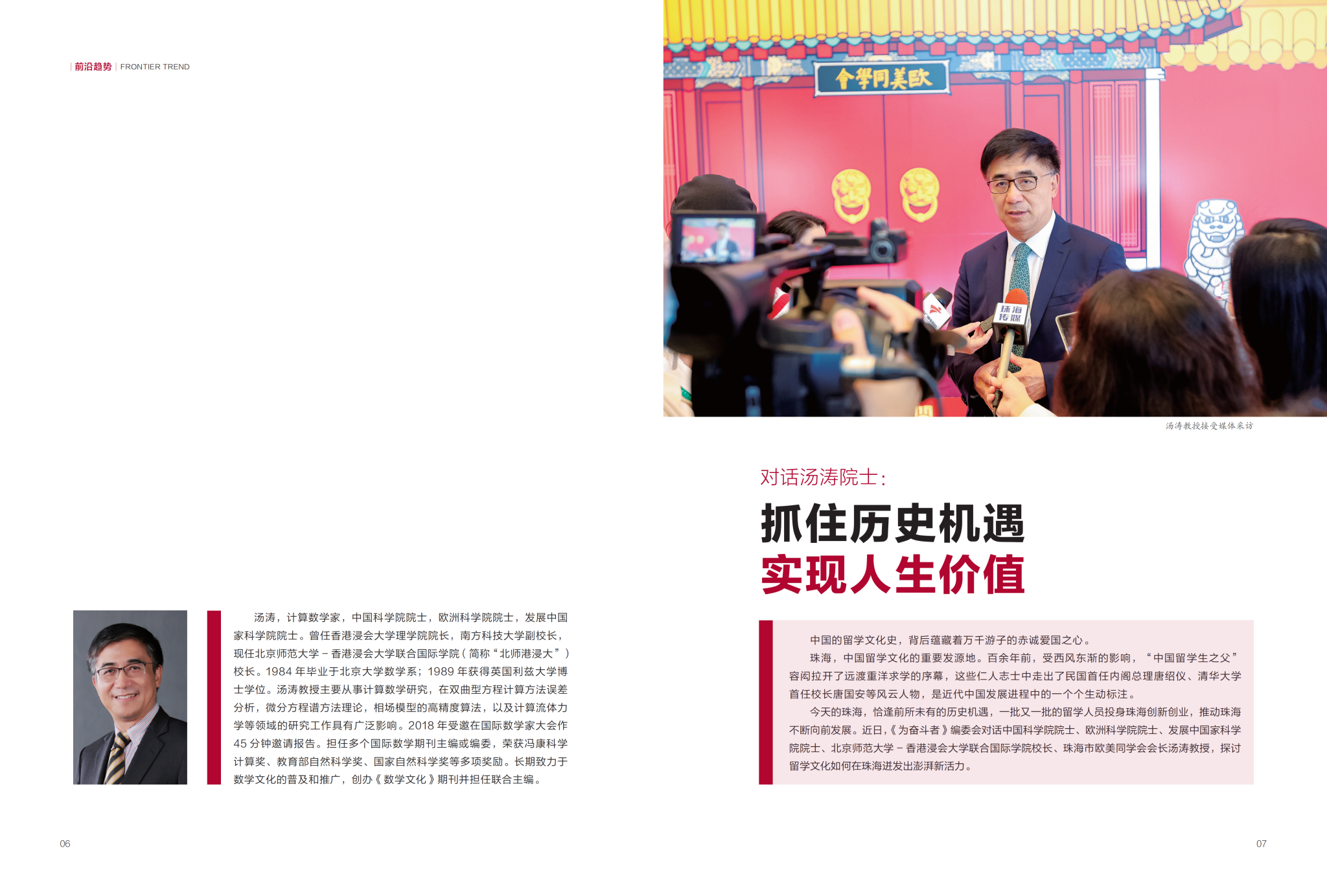 今天的珠海,恰逢前所未有的历史机遇,一批又一批的留学人员投身珠海创新创业,推动珠海不断向前发展。近日,《为奋斗者》编委会对话中国科学院院士、欧洲科学院院士、发展中国家科学院院士、北京师范大学-香港浸会大学联合国际学院校长、珠海市欧美同学会会长汤涛教授,探讨留学文化如何在珠海迸发出澎湃新活力。