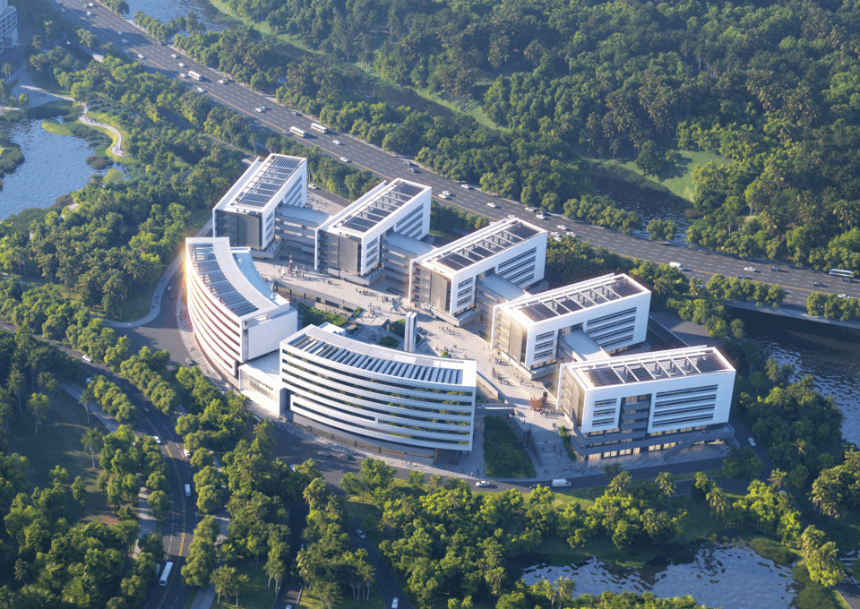 作为学校二期校园项目的重要组成部分之一,教学组团I标段建设面积约9.3万平方米,由五栋教学实验楼、一栋办公楼及配套设施组成,整体布局犹如一只张开的智慧之眼,形成鲜明的学术地标形象。
