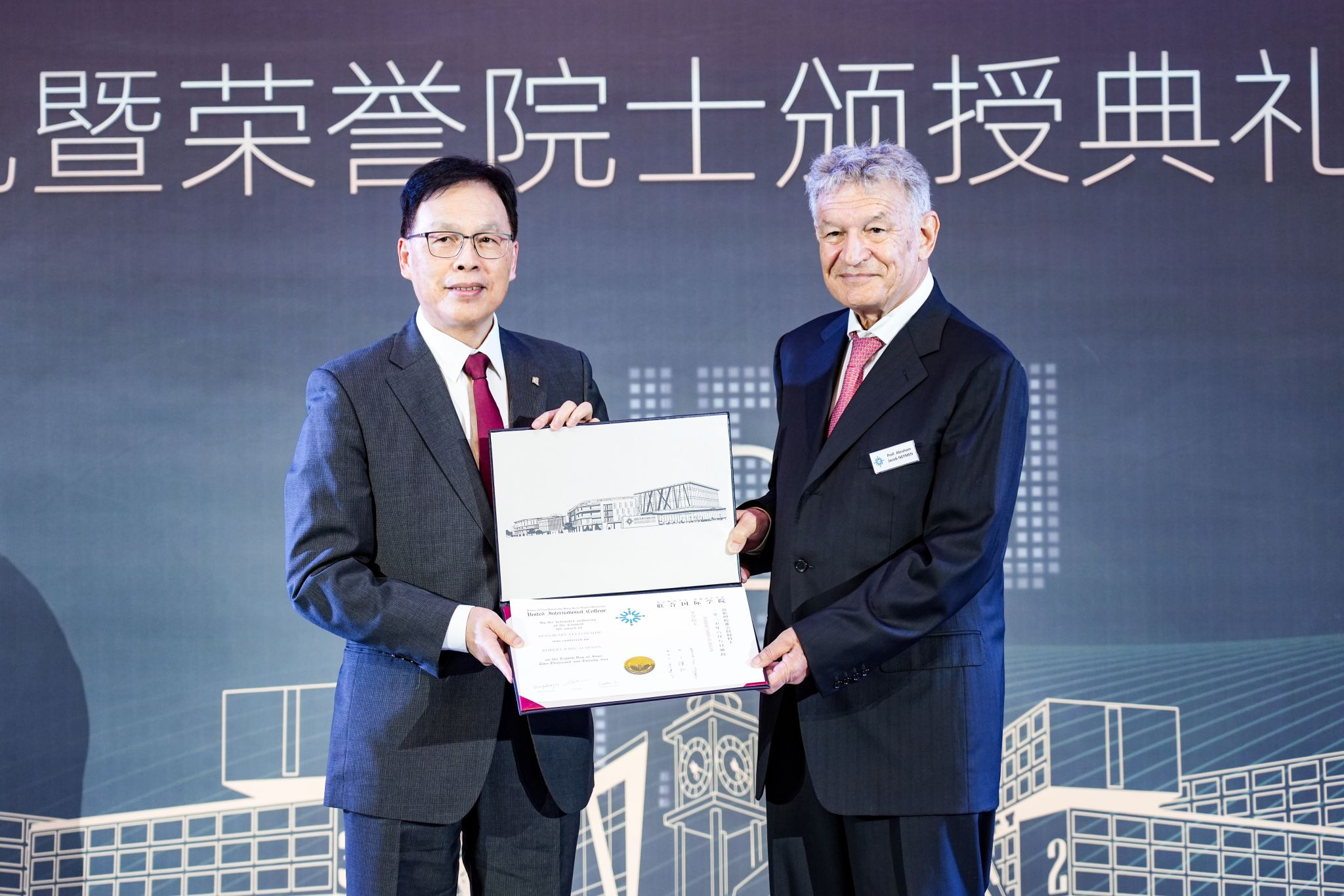此次颁授典礼由Aumann教授的学生、欧洲科学院院士、耶路撒冷希伯来大学荣休教授Abraham Neyman代为出席。北师港浸大工商管理学院刘鲁川教授在博士阶段正是师从Neyman教授。师门三代缘聚北师港浸大,Aumann教授衷心祝福刘教授在推广博弈论上再攀高峰。
